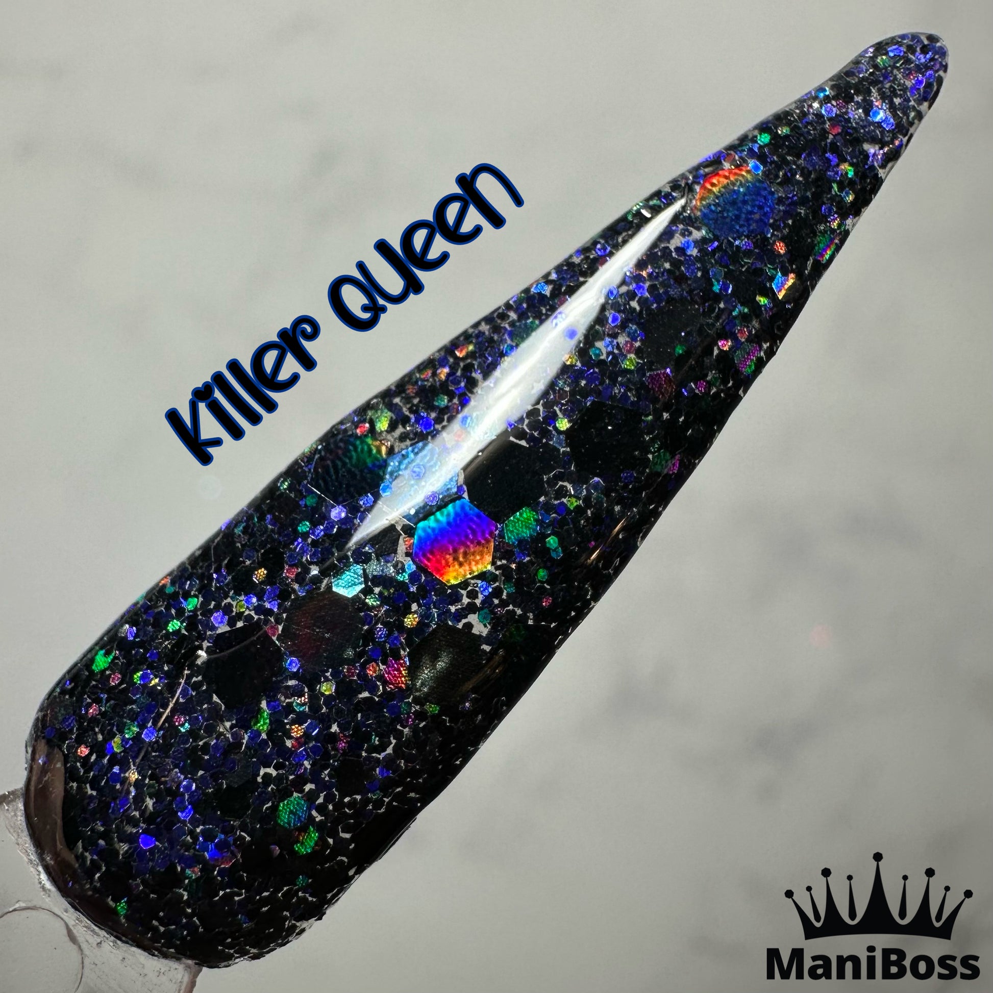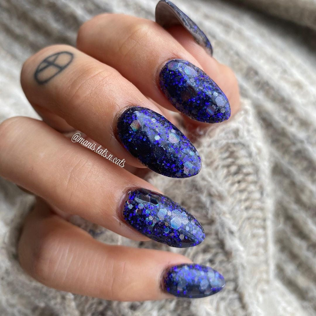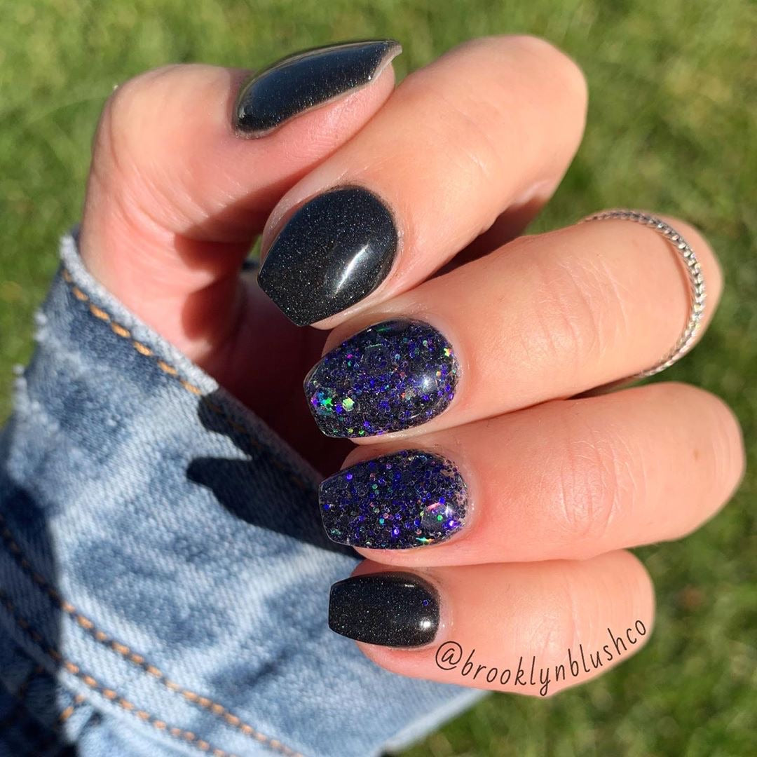 Purple/blue/black/rainbow color shift base with chunky black holographic glitter