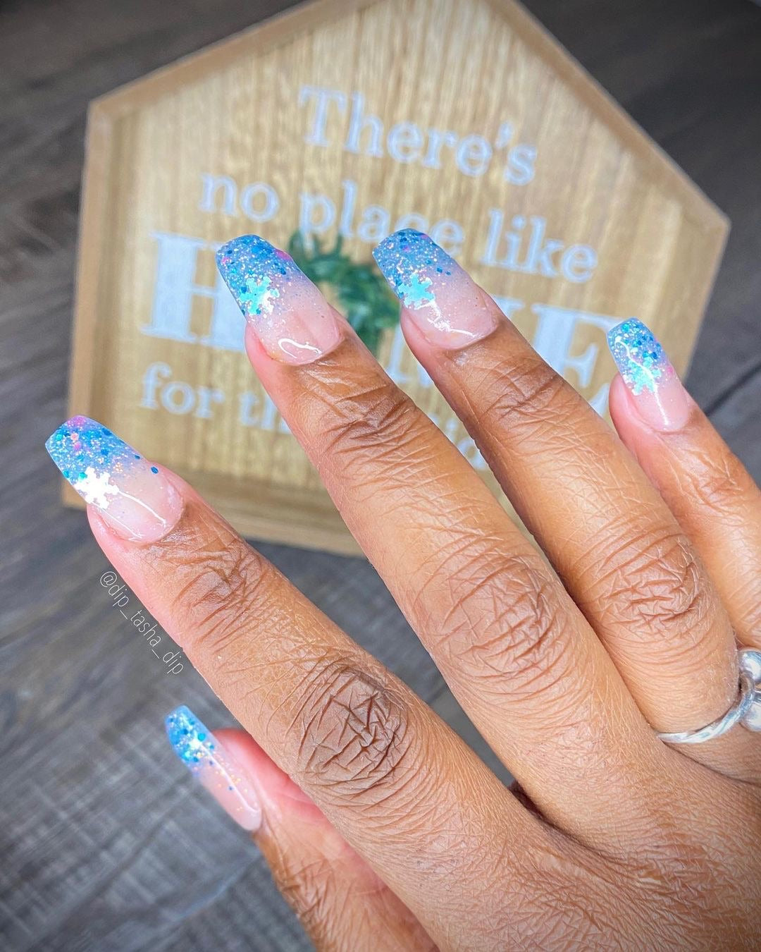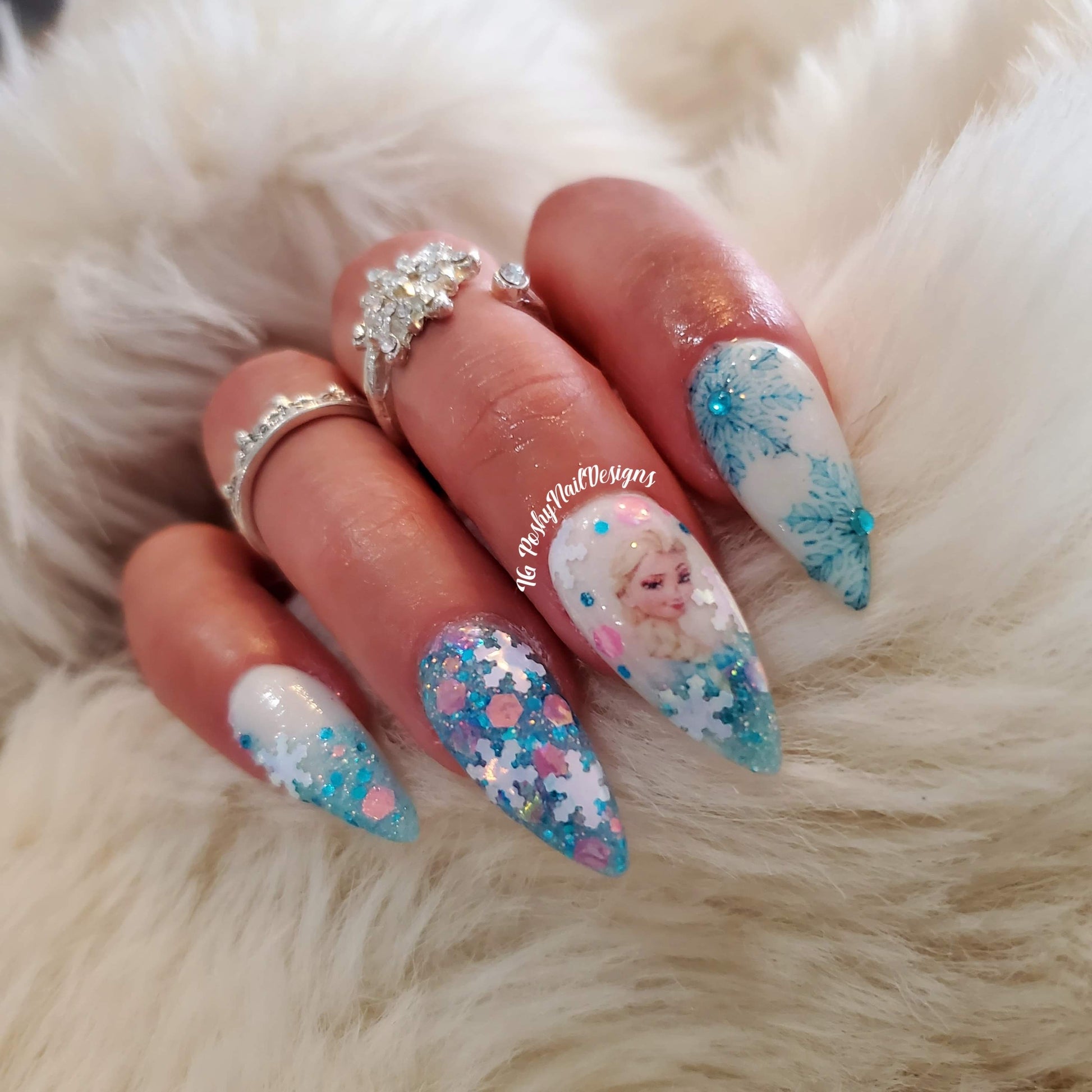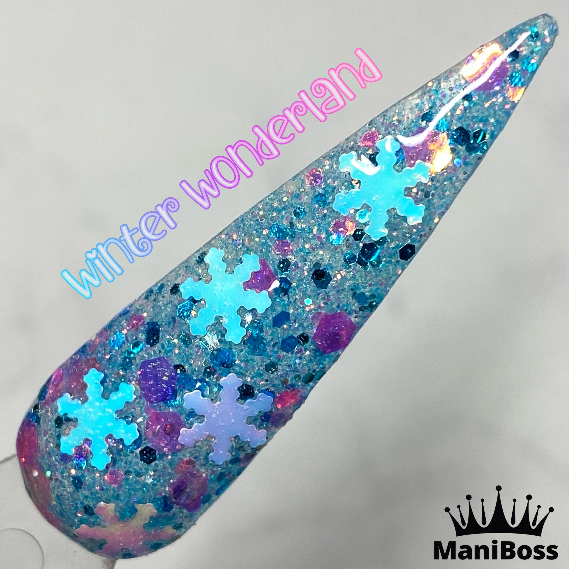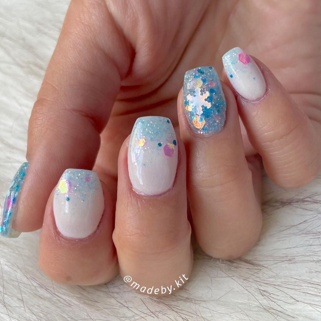 It's super pretty, but difficult to get the snowflake glitters on the nail. I placed them where I wanted them. I feel like I need to buy that tiny tool that bends the glitters so they curve to you nail. I think that would help them stay down and adhere better. I did 2 layers of the glitter first one I poured over, pressed down and the second I placed the snowflakes then poured over and pressed down. I then did 2 thin layers of clear over so I could file without damaging the glitter.